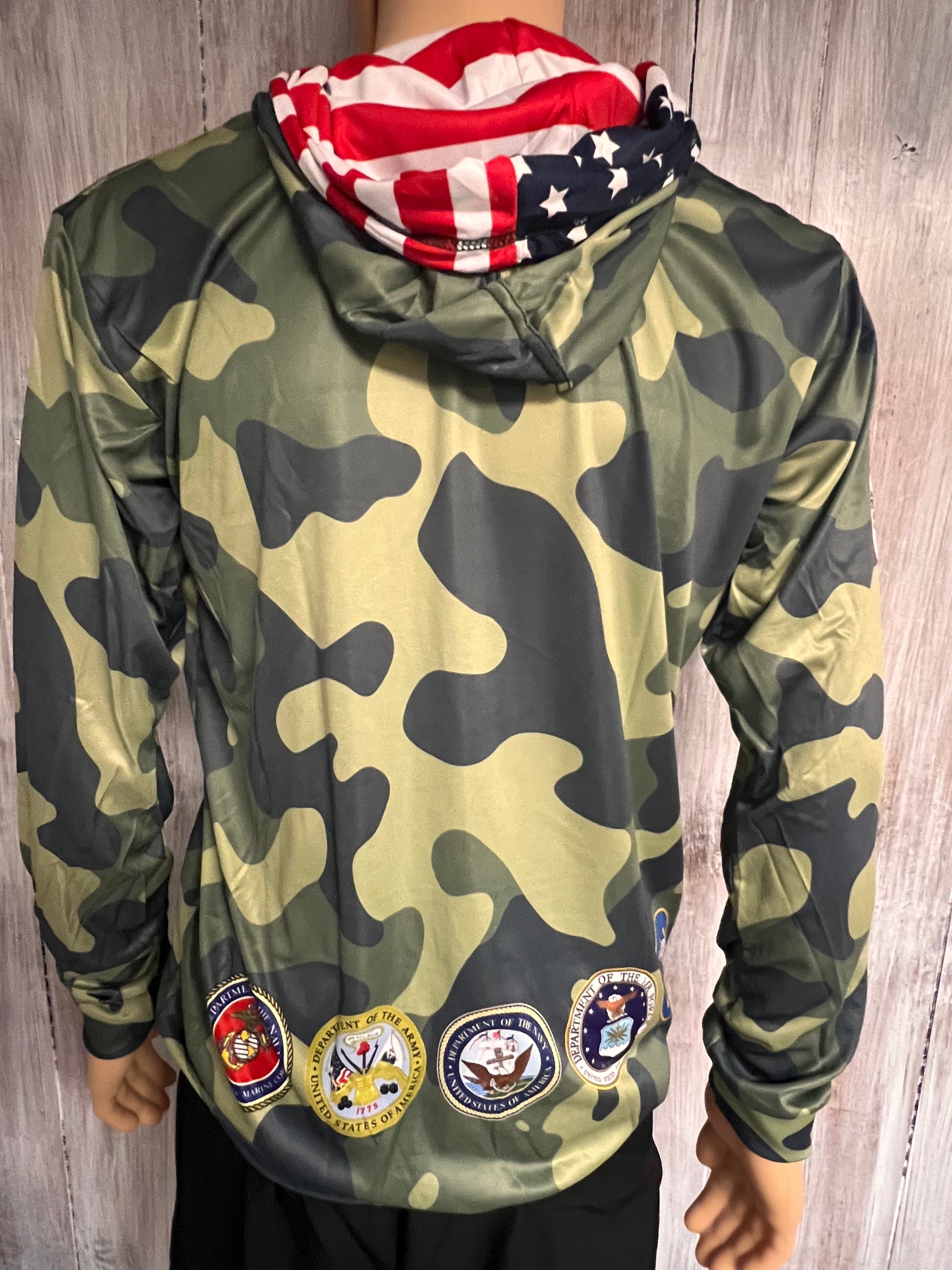 Lite Weight Green Camo USA Patriots long sleeve Pullover. With USA Patriots Amputee Softball logo on front, with Military branch emblems on the lower back. Lining the hood is the US flag. This is a Fully Sublimated designed Pullover with ribbed cuffs and waistband and kangaroo pocket.
