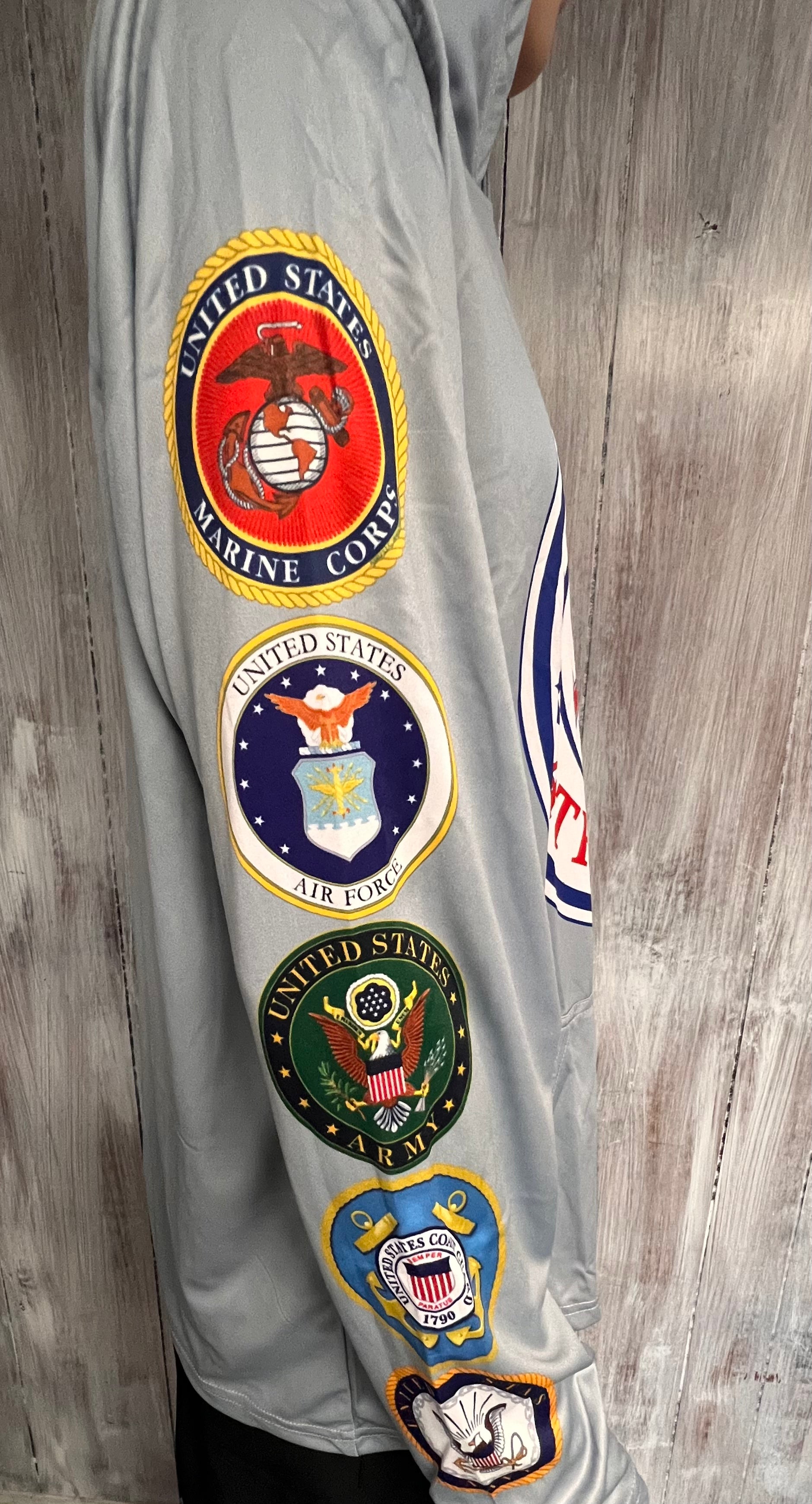 Lite Weight White USA Patriots long sleeve Pullover. With USA Patriots Amputee Athletics logo on front, with Military branch emblems on the right sleeve. This is a Fully Sublimated designed Pullover with open cuffs and waistband and kangaroo pocket.