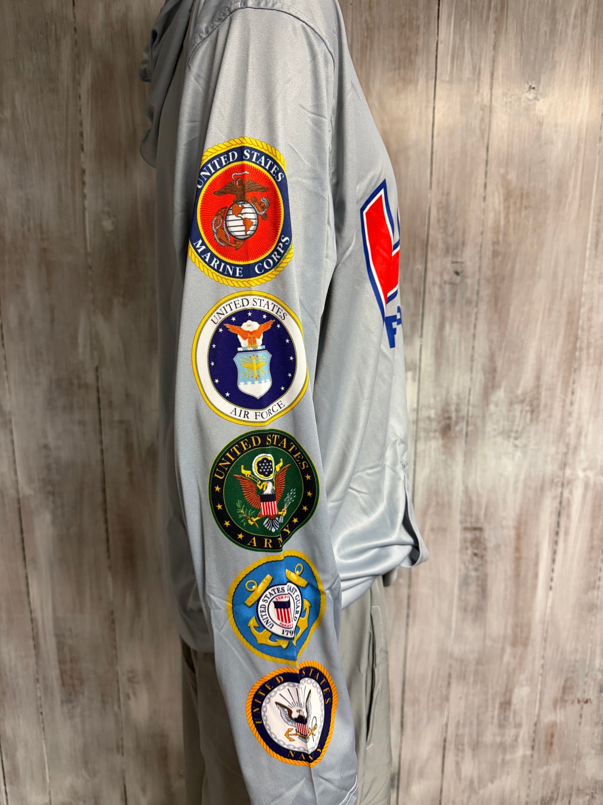 Lite Weight Gray USA Patriots long sleeve Pullover. With USA Patriots logo on front, with Military branch emblems on the right sleeve. This is a Fully Sublimated designed Pullover with open cuffs and waistband and kangaroo pocket.