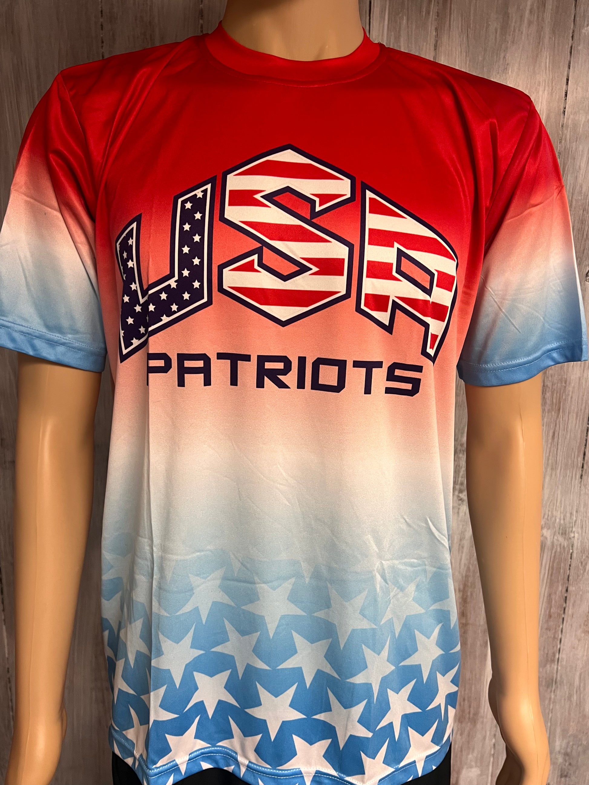 Red, White, & Blue USA Patriots short sleeve jersey. With USA Patriots logo on front with USA Patriots logo and statement of "Serving beyond the uniform on back. This is a Fully Sublimated designed Jersey.