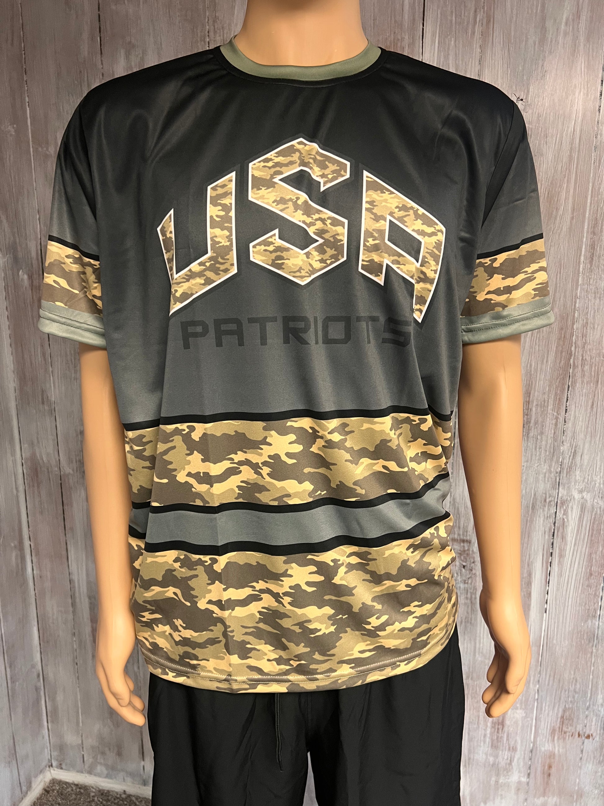 Green camo USA Patriots short sleeve jersey. With USA Patriots logo on front with military branch logos on back. This is a Fully Sublimated designed Jersey.